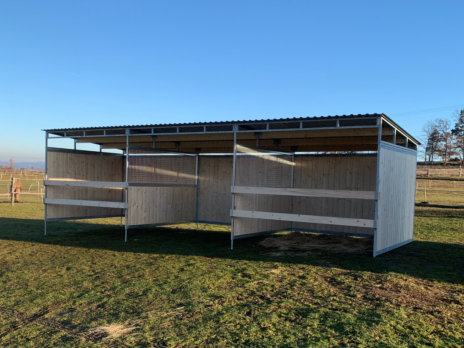 Tento přístřešek kombinuje pevnou ocelovou konstrukci, kvalitní dřevěné stěny (35 mm) a pozinkovanou střechu z trapézových plechů, což zajišťuje dlouhou životnost a spolehlivou ochranu před nepříznivým počasím. Výška 2,5 m poskytuje dostatek prostoru pro pohodlné ustájení koní. Rychlá montáž a odolné materiály dělají z tohoto přístřešku ideální řešení pro venkovní ustájení.