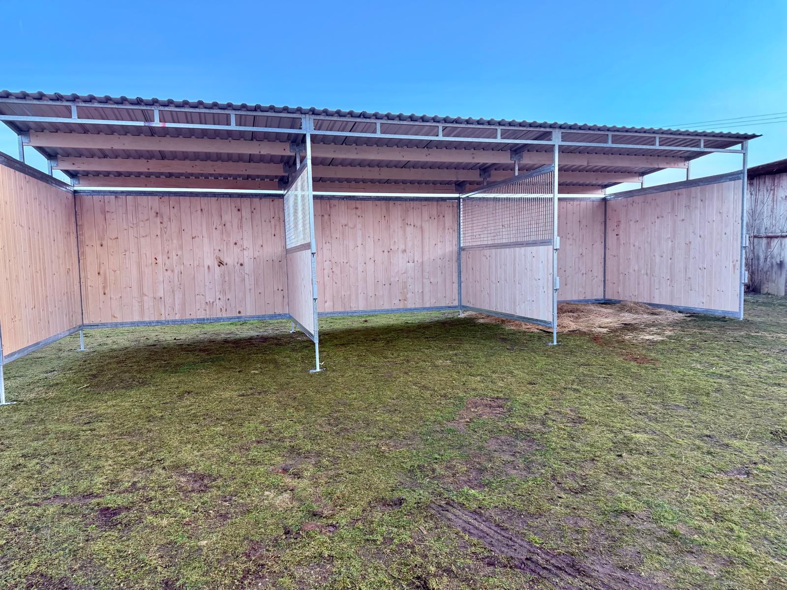 Dřevěný přístřešek pro koně 3 x 9 m se závorami a dělícími stěnami